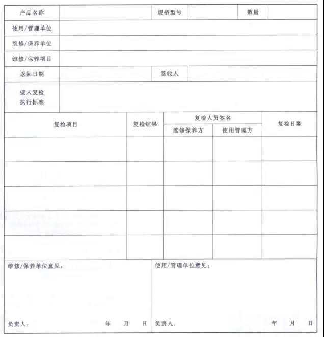 4、產(chǎn)品維修后,應(yīng)依據(jù)相關(guān)產(chǎn)品標(biāo)準(zhǔn)進(jìn)行檢驗(yàn),記錄檢驗(yàn)結(jié)果,合格后應(yīng)加貼檢驗(yàn)合格標(biāo)識(shí)。