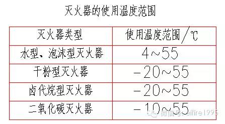 在非必要配置鹵代烷滅火器的場所,不得選用鹵代烷滅火器,宜選用磷酸銨鹽干粉或其他類型滅火器。滅火劑不相容的滅火器不能在同一場合應用,滅火器的適用溫度應符合環(huán)境溫度的要求。